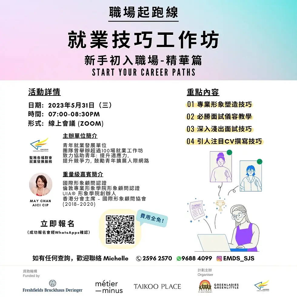 就嚟畢業要搵工啦,你準備好未?我哋將舉行就業技巧工作坊,由面試穿搭、撰寫CV、面試對答到面試準備,深入淺出教你求職技巧,等你係求職市場突圍而出!工作坊邀請重量級嘉賓May Chan,國際形象顧問認證及UIA® 形象學院創辦人;為參加者提供專業形象塑造技巧,同埋必勝面試儀容教學。